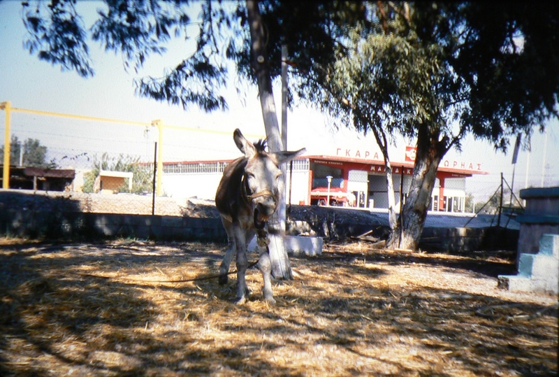 We stop at the first camp site (International) not very good at all. Moved on again seeing there was another site nearby (Pelecan). Instead we find Attikon "under English management". Frederick Porter-Miles, ex BOAC pilot, greeted us and showed us his bit of 'beach' - a circular pond and then we talked for hours - were introduced to retsina champagne (with less than 50% soda) - had conducted tour of the toilets - and were introduced to the camp site's president Pud-pud (dog) and chairman Charley Boy (donkey). Mrs Daisy Porter-Miles is a Coptic Christian, educated in France (first language French) and speaks about 7 languages. After 2 bottles of retsina we had lunch.
