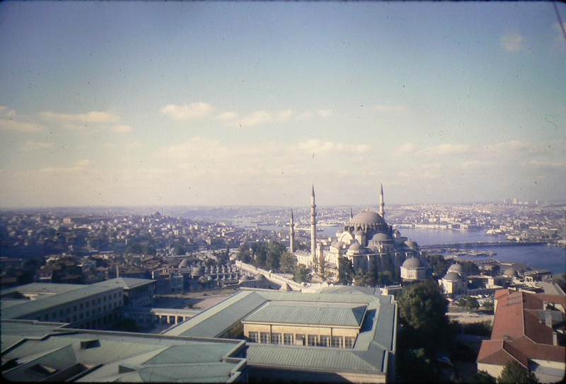 Instead we go to the Suleymaniye Mosque which overlooks the Golden Horn. The University is in the way so through we go, or do we? There isn't an exit at the other side but a good photo of Golden Horn. While returning we find that we can ascend the Beyazit Tower - their version of the GPO tower (rather older than ours). After some deliberation we take some photos through the windows at the top of the tower. Descending Brian says the spiral staircase (which is somewhat rickety) doesn't do his constitution any good. It is a strange sensation galloping down, and when I get to the bottom I have to wait some minutes for Brian to appear. On to the Mosque where a service is in progress.