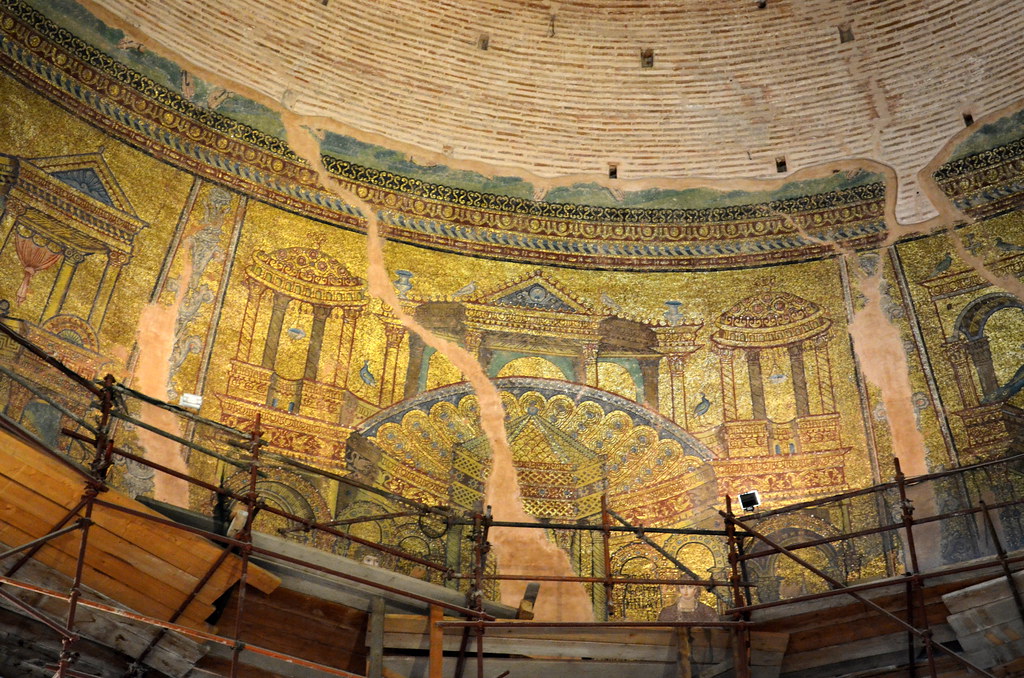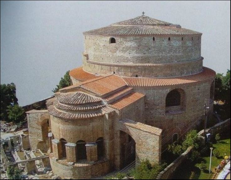 Put on natty city outfit and head for Thessalonica. Get to Eva's at 10:30, have coffee, meet grandmother, Soula. Set off with Soula, Eva and Nikos (Eva's brother) and, on the way to the car, visit an early Byzantine basilica (church with nave, aisles and apse only) called Acheiropoiétos ("not made by hand") - which may have referred to an almost all silver icon.