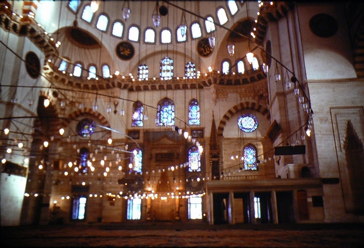 Instead we go to the Suleymaniye Mosque which overlooks the Golden Horn. The University is in the way so through we go, or do we? There isn't an exit at the other side but a good photo of Golden Horn. While returning we find that we can ascend the Beyazit Tower - their version of the GPO tower (rather older than ours). After some deliberation we take some photos through the windows at the top of the tower. Descending Brian says the spiral staircase (which is somewhat rickety) doesn't do his constitution any good. It is a strange sensation galloping down, and when I get to the bottom I have to wait some minutes for Brian to appear. On to the Mosque where a service is in progress.