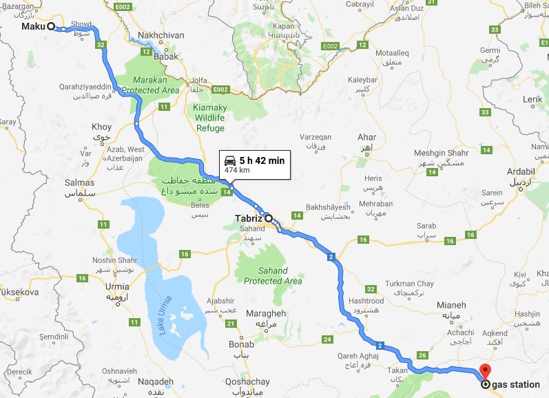 It was now 6:15, though the clocks went forward 1½ hours, thus we had been there 2 hours altogether. It was now dark, and a new country. The first town is Maku, so we stopped there for food; the only petrol station would not allow us to park on its forecourt so after we had eaten (kebab and chamois leather, with an onion 20 rials each) we drove out to a parking place some way out where we had coffee - and gave three locals some.