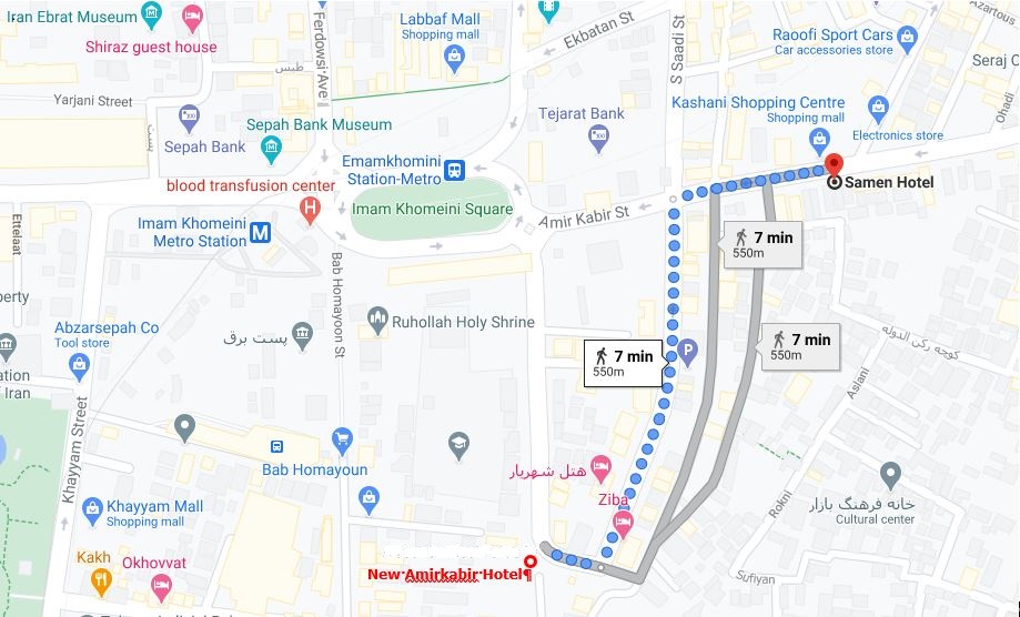 It seems the old Hotel Amir Kabir where we stayed is no longer. The map I drew allowed me to locate it pretty accurately on the south side of Amir Kabir Street, east of S Saadi Street, between Behnaz Alley and Mellat Street, and about 200m from what is now called Imam Khomeini Square, which used to be Tūpkhāneh, meaning army barracks. In fact the present day Samen Hotel must be very close to the location of the old Hotel Amir Kabir, so I have used it on maps. As the photos show, by 1983, during the Iran/Iraq war, the old hotel had seen better days. There is now a new Hotel Amirkabir about 300m south of Imam Khomeini Square on a dead-end extension of Naser Khosrow Street.