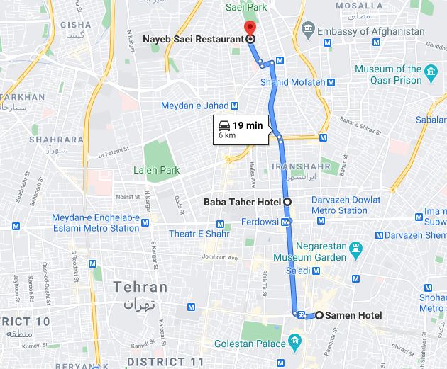 After the Marmar, built in 1967, fully refurbished in 2014, and now called the Baba Taher Hotel, we moved on to the Nayeb Restaurant, famous for its Chelo Kebab. It was really delicious. The best meal I've had since leaving England. First you get the rice which you prepare with butter and the yoke of an egg, then the kebabs - which is lamb with some tomatoes, sauce for the meat and more butter if you want it. And to accompany it some delicious savoury yoghourt with bits of raw onion (which is eaten everywhere here). I'm acquiring quite a taste for raw onion, but it's not a very social food. I followed all that with a vast slice of melon (I didn't know it was going to be so vast). Really pig-like.