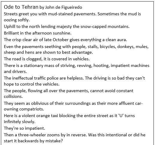 Happily, Heinz was back when we returned so we could have coffee, for which he joined us, again. Tomorrow we must rise early, it's already 11:40pm. The weather was beautiful, bright and clear, sunny but rather cold. Snow is forecast. The mountains make a beautiful backcloth, covered in snow, with the sun shining on them. And the soft warm glow of sunset highlights the natural colour of the rock. I felt moved to write "An Ode to Tehran".