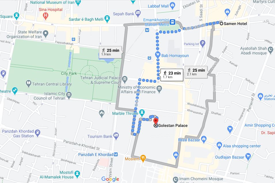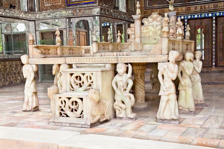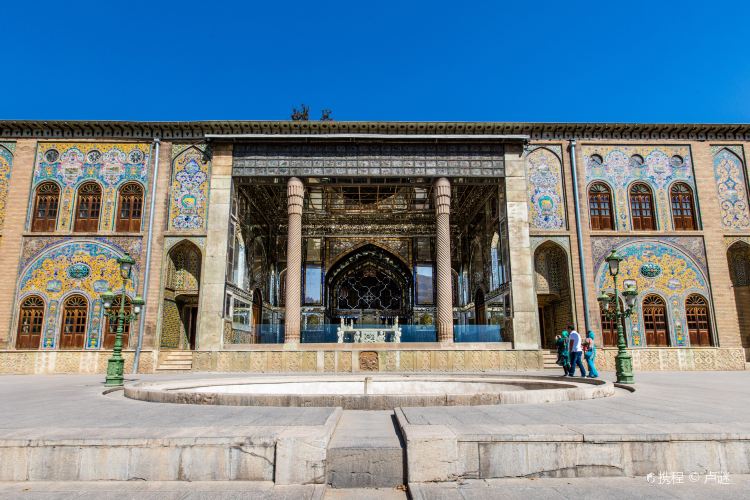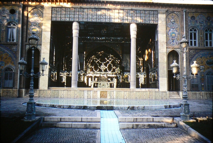Later we ventured forth to the Golestan Palace. For your 30R you get a guided tour, in fact Brian and I had a 'chick' all to ourselves. She was probably older than us and was very pleasant. The palace is most impressive. The entrance and staircase are covered in mirrors, even the ceiling. The lower part of the walls is covered with tiles (from Mashhad?). First we were shown the coronation room. Shah Reza Pahlavi had himself crowned here in 1967. There are carpets, of course, and some beautifully carved furniture from Kashmir. Some ghastly Victoriana including a mammoth clock with a peacock dancing in front of it, which is now defunct. There is another Victorian clock which has lots of little dials round it showing the time in other countries. There is a replica of the Peacock Throne, what a lot of jewels, but the settings somehow make them look like bits of glass. You can't appreciate their beauty. There is some other porcelain from Europe and Russia, all gifts from various monarchs. Also, some good paintings by Iranian artists.